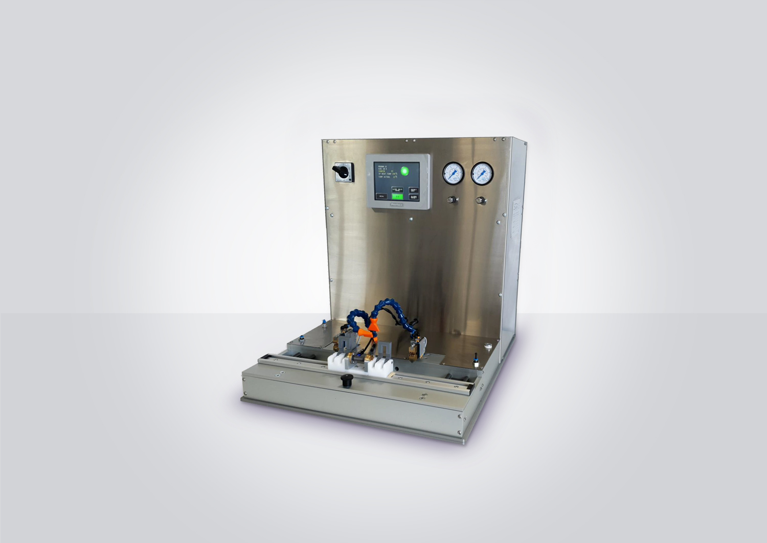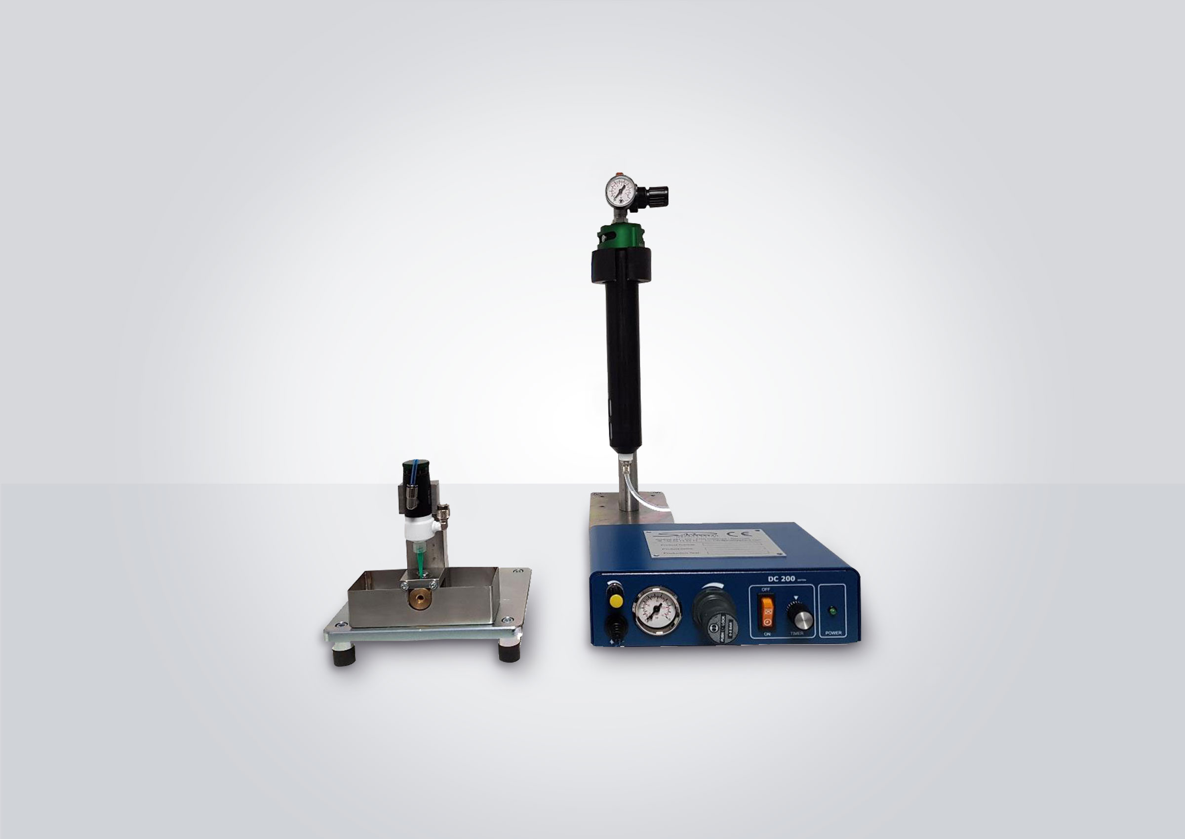 The glue dispenser station is designed to apply Cyclohexanone to medical PVC tubing.